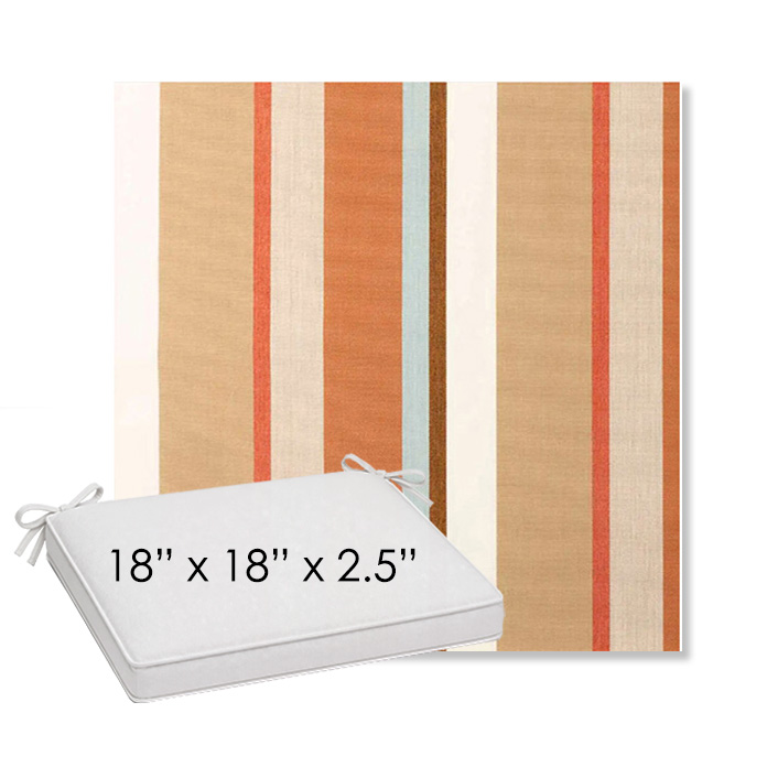 18" x 18" x 2.5" Thick outdoor dining chair seat cushion designed for a simple, ready-to-order fit. Features a boxed construction with piping, fabric ties, and zipper opening. Made in 700+ Sunbrella® fabrics for long-lasting outdoor performance.
