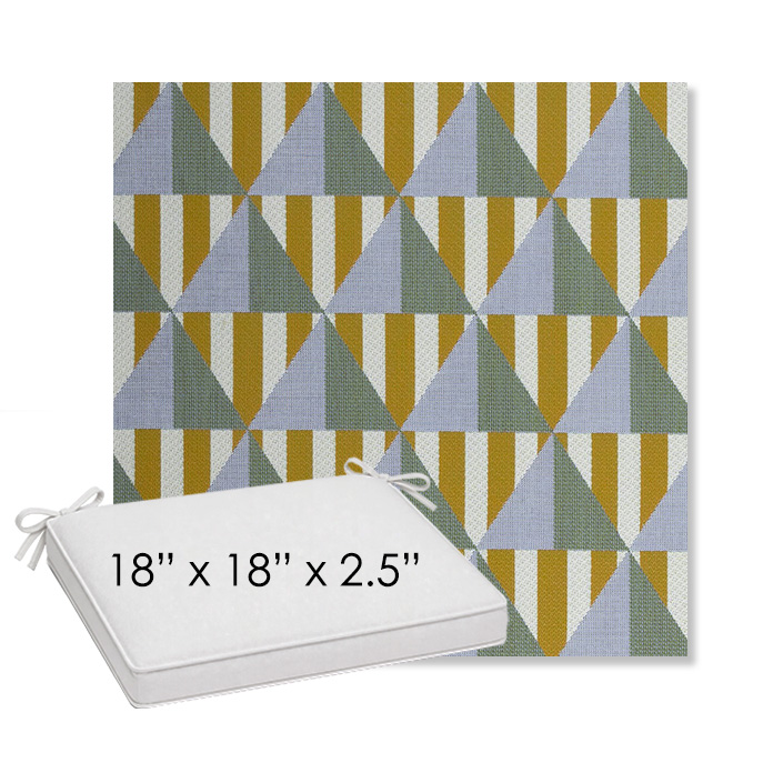18" x 18" x 2.5" Thick outdoor dining chair seat cushion designed for a simple, ready-to-order fit. Features a boxed construction with piping, fabric ties, and zipper opening. Made in 700+ Sunbrella® fabrics for long-lasting outdoor performance.