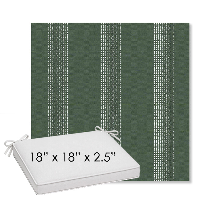 18" x 18" x 2.5" Thick outdoor dining chair seat cushion designed for a simple, ready-to-order fit. Features a boxed construction with piping, fabric ties, and zipper opening. Made in 700+ Sunbrella® fabrics for long-lasting outdoor performance.