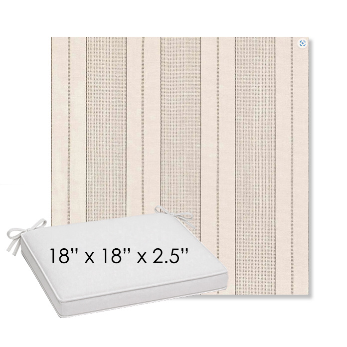 18" x 18" x 2.5" Thick outdoor dining chair seat cushion designed for a simple, ready-to-order fit. Features a boxed construction with piping, fabric ties, and zipper opening. Made in 700+ Sunbrella® fabrics for long-lasting outdoor performance.