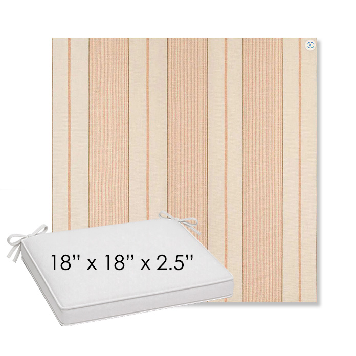 18" x 18" x 2.5" Thick outdoor dining chair seat cushion designed for a simple, ready-to-order fit. Features a boxed construction with piping, fabric ties, and zipper opening. Made in 700+ Sunbrella® fabrics for long-lasting outdoor performance.