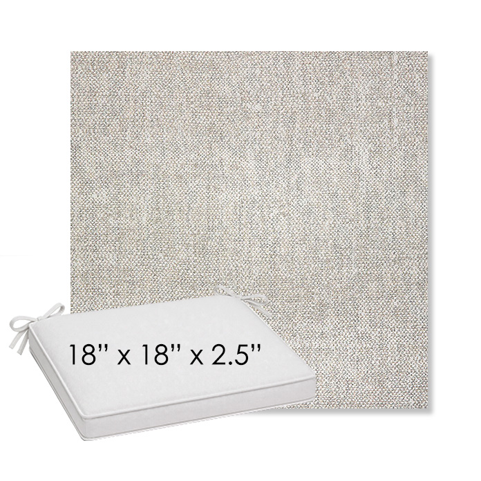 18" x 18" x 2.5" Thick outdoor dining chair seat cushion designed for a simple, ready-to-order fit. Features a boxed construction with piping, fabric ties, and zipper opening. Made in 700+ Sunbrella® fabrics for long-lasting outdoor performance.