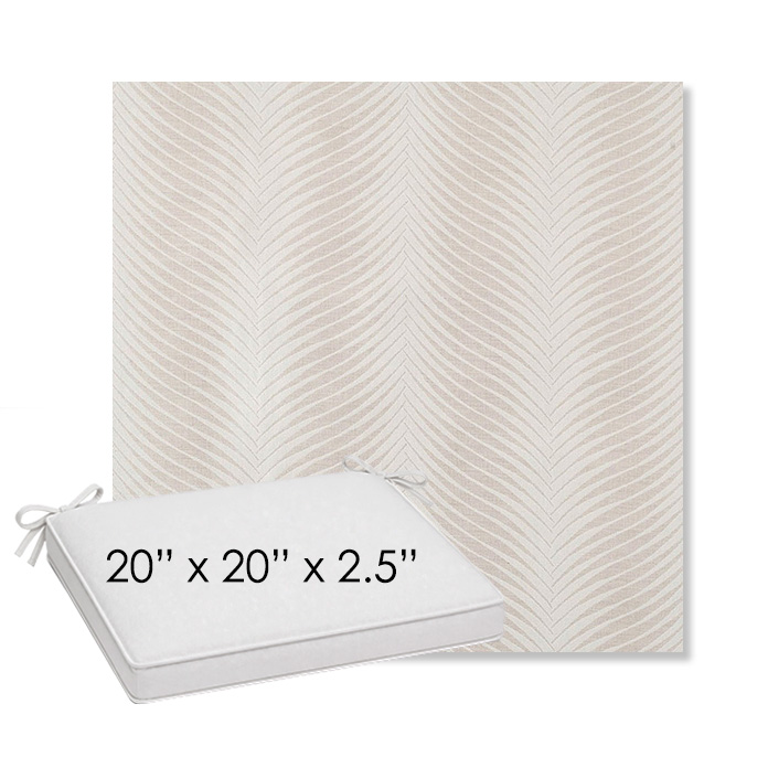 20" x 20" x 2.5" Thick outdoor dining chair seat cushion designed for a simple, ready-to-order fit. Features a boxed construction with piping, fabric ties, and zipper opening. Made in 700+ Sunbrella® fabrics for long-lasting outdoor performance.