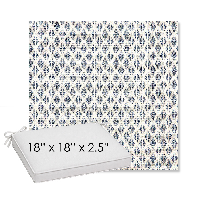 18" x 18" x 2.5" Thick outdoor dining chair seat cushion designed for a simple, ready-to-order fit. Features a boxed construction with piping, fabric ties, and zipper opening. Made in 700+ Sunbrella® fabrics for long-lasting outdoor performance.
