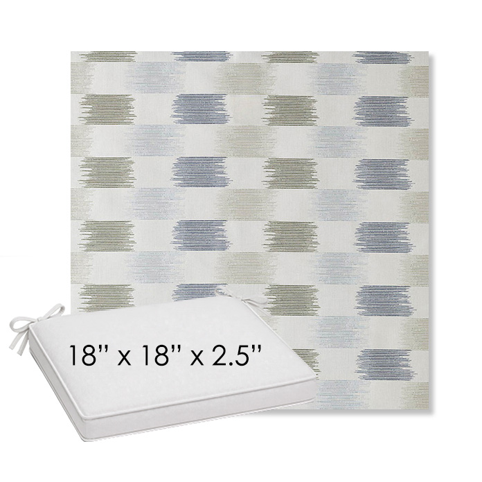 18" x 18" x 2.5" Thick outdoor dining chair seat cushion designed for a simple, ready-to-order fit. Features a boxed construction with piping, fabric ties, and zipper opening. Made in 700+ Sunbrella® fabrics for long-lasting outdoor performance.