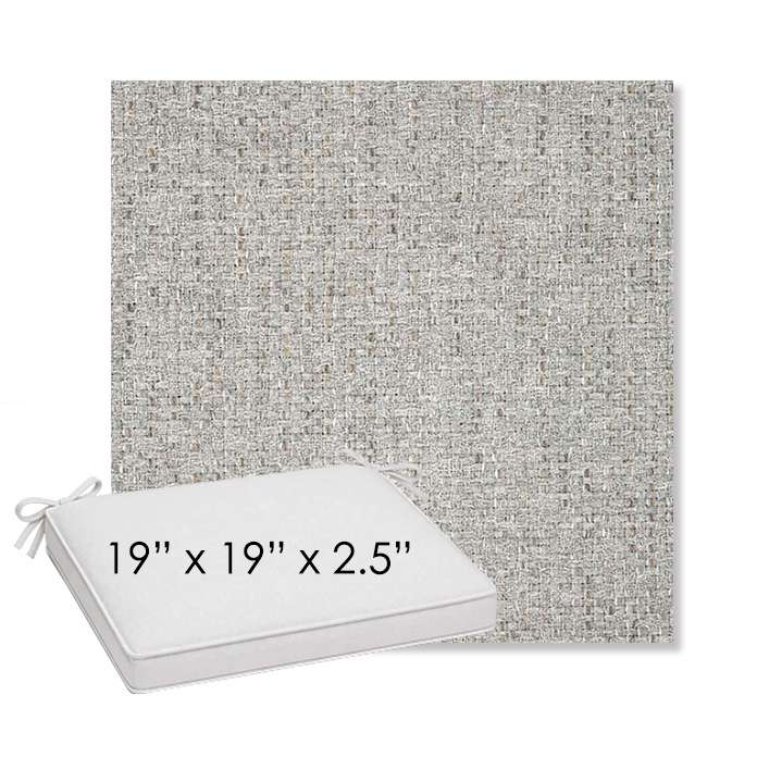 19" x 19" x 2.5" Thick outdoor dining chair seat cushion designed for a simple, ready-to-order fit. Features a boxed construction with piping, fabric ties, and zipper opening. Made in 700+ Sunbrella® fabrics for long-lasting outdoor performance.