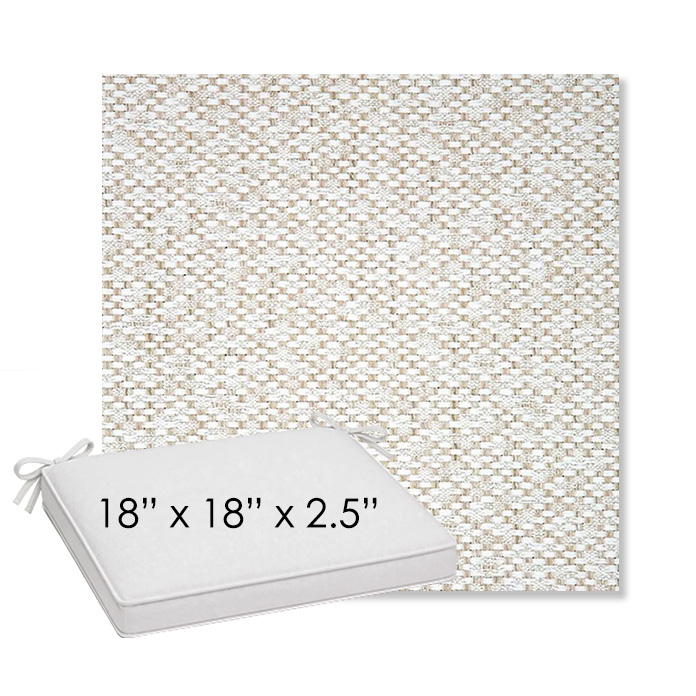 18" x 18" x 2.5" Thick outdoor dining chair seat cushion designed for a simple, ready-to-order fit. Features a boxed construction with piping, fabric ties, and zipper opening. Made in 700+ Sunbrella® fabrics for long-lasting outdoor performance.