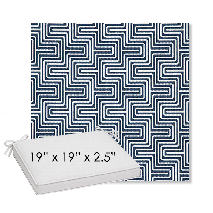 19" x 19" x 2.5" Thick outdoor dining chair seat cushion designed for a simple, ready-to-order fit. Features a boxed construction with piping, fabric ties, and zipper opening. Made in 700+ Sunbrella® fabrics for long-lasting outdoor performance.