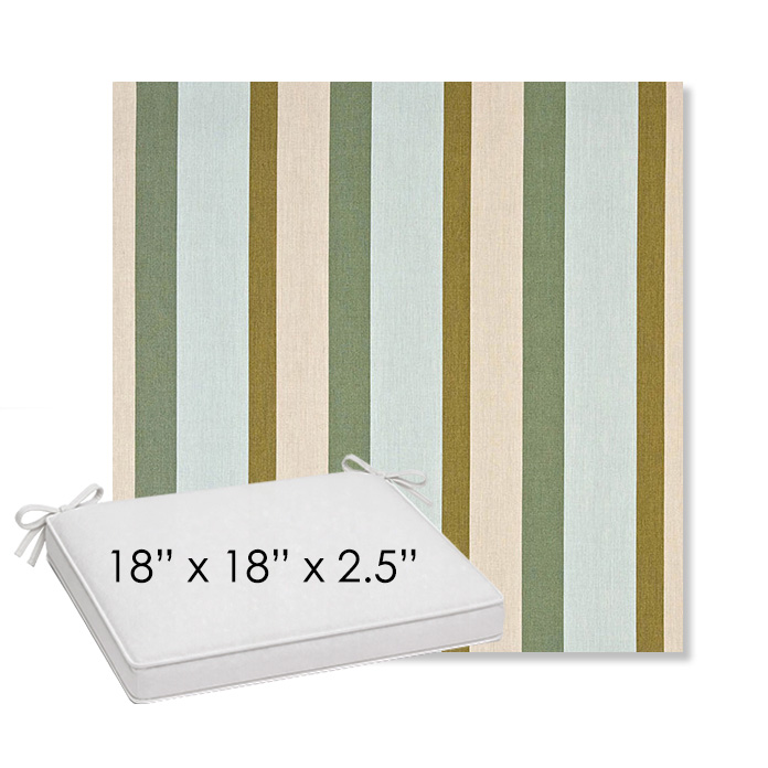 18" x 18" x 2.5" Thick outdoor dining chair seat cushion designed for a simple, ready-to-order fit. Features a boxed construction with piping, fabric ties, and zipper opening. Made in 700+ Sunbrella® fabrics for long-lasting outdoor performance.