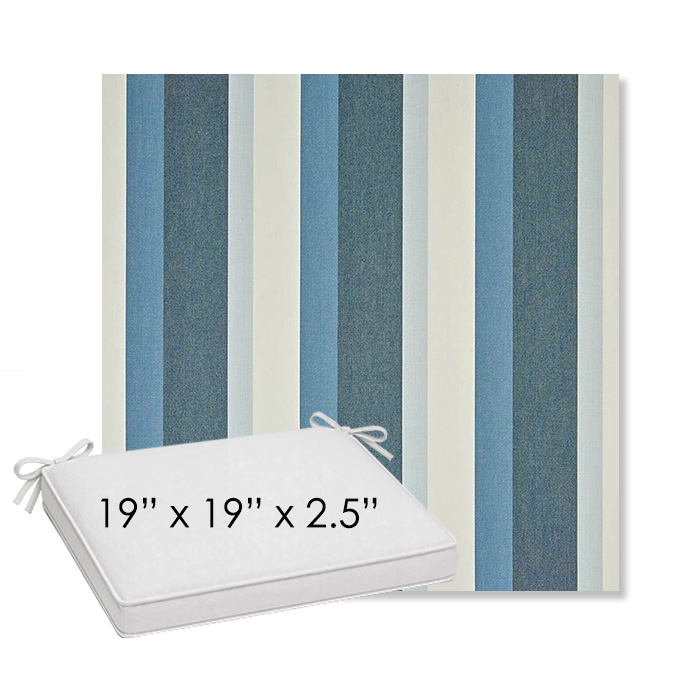 19" x 19" x 2.5" Thick outdoor dining chair seat cushion designed for a simple, ready-to-order fit. Features a boxed construction with piping, fabric ties, and zipper opening. Made in 700+ Sunbrella® fabrics for long-lasting outdoor performance.