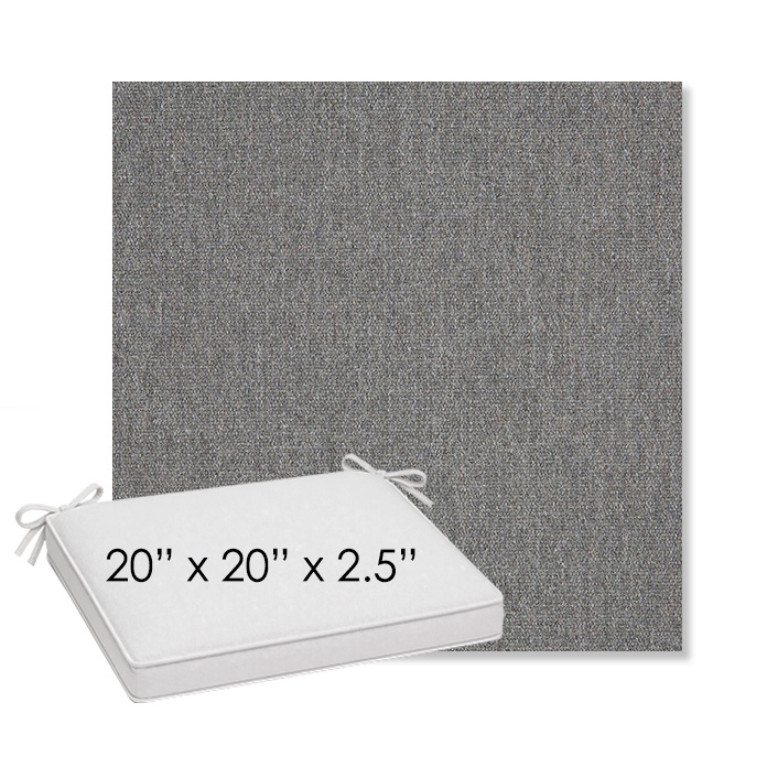 20" x 20" x 2.5" Thick outdoor dining chair seat cushion designed for a simple, ready-to-order fit. Features a boxed construction with piping, fabric ties, and zipper opening. Made in 700+ Sunbrella® fabrics for long-lasting outdoor performance.
