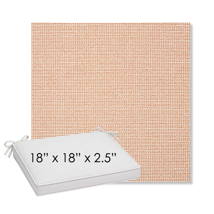 18" x 18" x 2.5" Thick outdoor dining chair seat cushion designed for a simple, ready-to-order fit. Features a boxed construction with piping, fabric ties, and zipper opening. Made in 700+ Sunbrella® fabrics for long-lasting outdoor performance.