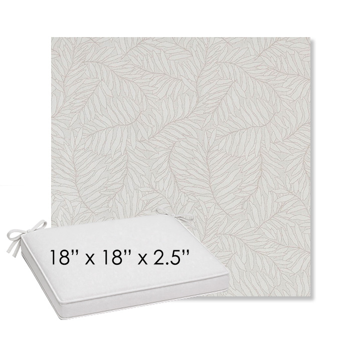 18" x 18" x 2.5" Thick outdoor dining chair seat cushion designed for a simple, ready-to-order fit. Features a boxed construction with piping, fabric ties, and zipper opening. Made in 700+ Sunbrella® fabrics for long-lasting outdoor performance.