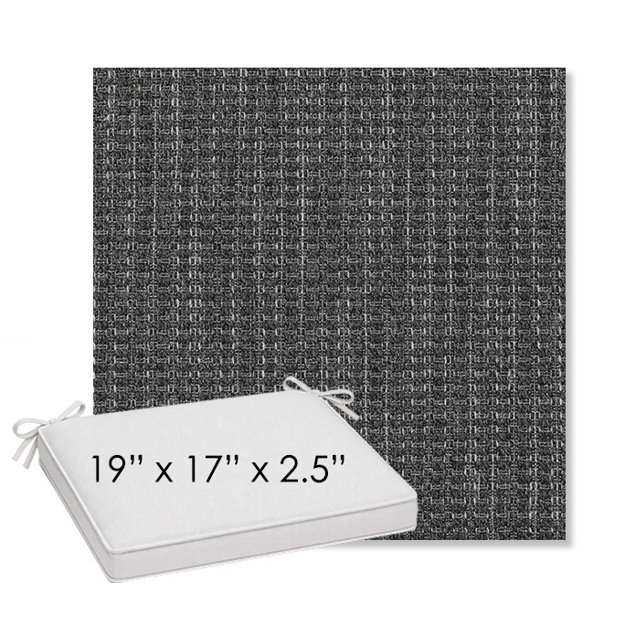 19" x 17" x 2.5" Thick outdoor dining chair seat cushion designed for a simple, ready-to-order fit. Features a boxed construction with piping, fabric ties, and zipper opening. Made in 700+ Sunbrella® fabrics for long-lasting outdoor performance.