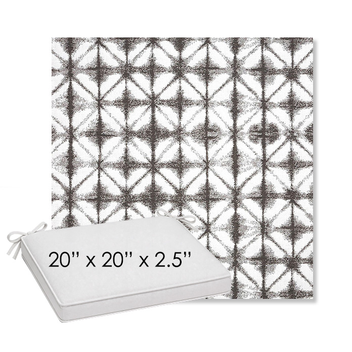 20" x 20" x 2.5" Thick outdoor dining chair seat cushion designed for a simple, ready-to-order fit. Features a boxed construction with piping, fabric ties, and zipper opening. Made in 700+ Sunbrella® fabrics for long-lasting outdoor performance.