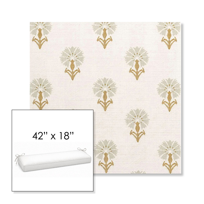 42" outdoor bench cushion designed for a simple, ready-to-order fit. Features a boxed construction with piping, fabric ties, and zipper opening. Made in 700+ Sunbrella® fabrics for long-lasting outdoor performance.