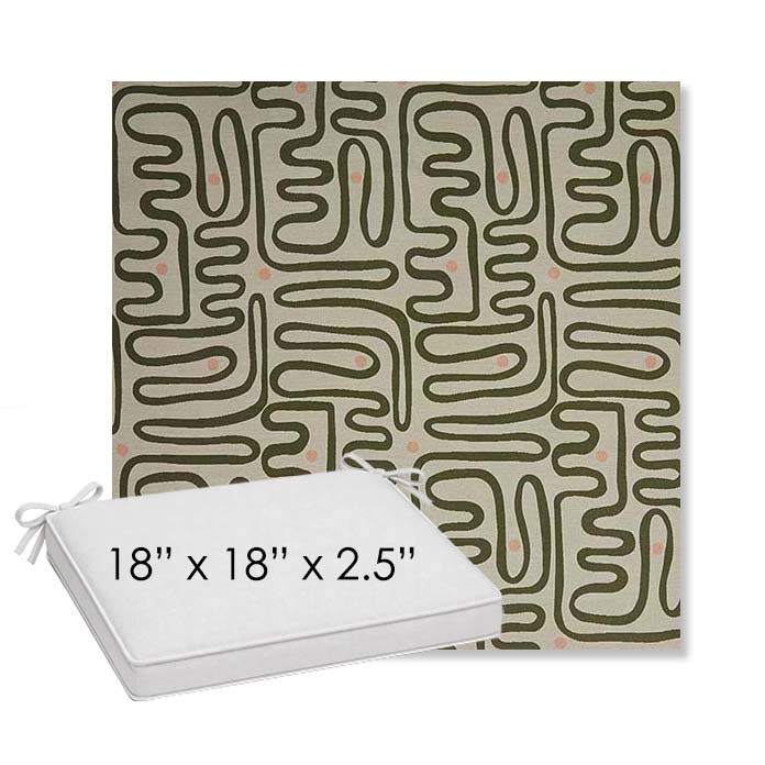 18" x 18" x 2.5" Thick outdoor dining chair seat cushion designed for a simple, ready-to-order fit. Features a boxed construction with piping, fabric ties, and zipper opening. Made in 700+ Sunbrella® fabrics for long-lasting outdoor performance.