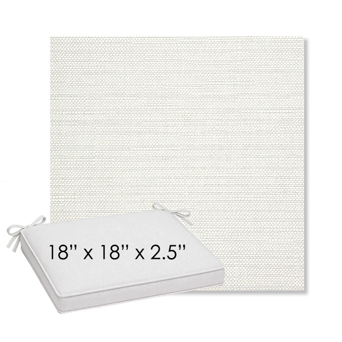18" x 18" x 2.5" Thick outdoor dining chair seat cushion designed for a simple, ready-to-order fit. Features a boxed construction with piping, fabric ties, and zipper opening. Made in 700+ Sunbrella® fabrics for long-lasting outdoor performance.
