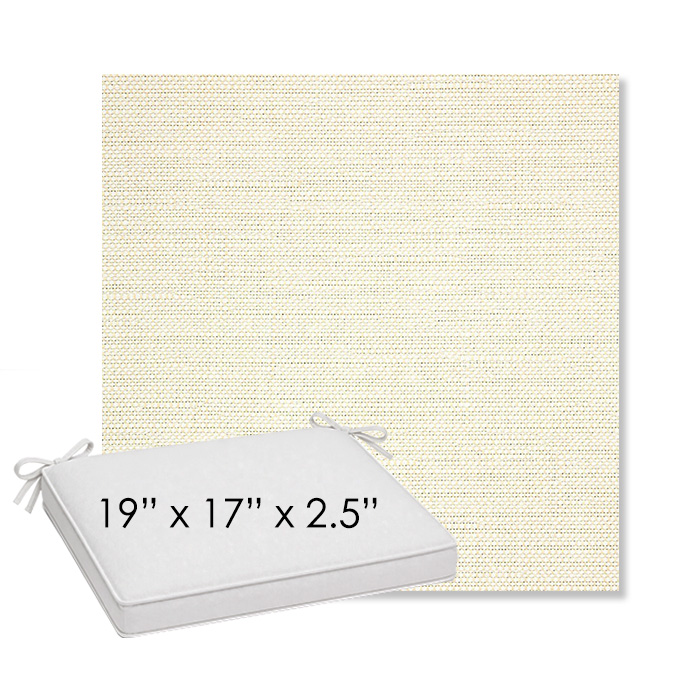 19" x 17" x 2.5" Thick outdoor dining chair seat cushion designed for a simple, ready-to-order fit. Features a boxed construction with piping, fabric ties, and zipper opening. Made in 700+ Sunbrella® fabrics for long-lasting outdoor performance.