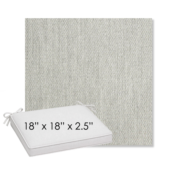 18" x 18" x 2.5" Thick outdoor dining chair seat cushion designed for a simple, ready-to-order fit. Features a boxed construction with piping, fabric ties, and zipper opening. Made in 700+ Sunbrella® fabrics for long-lasting outdoor performance.