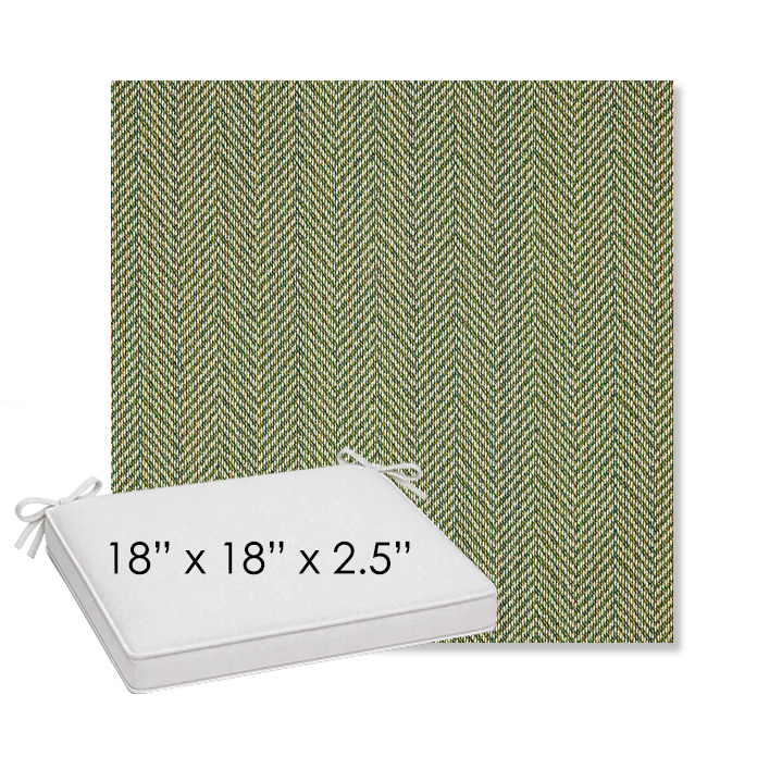 18" x 18" x 2.5" Thick outdoor dining chair seat cushion designed for a simple, ready-to-order fit. Features a boxed construction with piping, fabric ties, and zipper opening. Made in 700+ Sunbrella® fabrics for long-lasting outdoor performance.