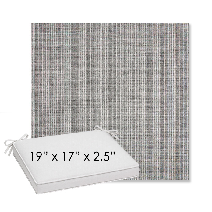 19" x 17" x 2.5" Thick outdoor dining chair seat cushion designed for a simple, ready-to-order fit. Features a boxed construction with piping, fabric ties, and zipper opening. Made in 700+ Sunbrella® fabrics for long-lasting outdoor performance.