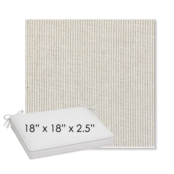 18" x 18" x 2.5" Thick outdoor dining chair seat cushion designed for a simple, ready-to-order fit. Features a boxed construction with piping, fabric ties, and zipper opening. Made in 700+ Sunbrella® fabrics for long-lasting outdoor performance.