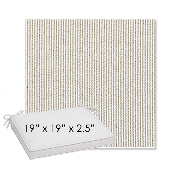 19" x 19" x 2.5" Thick outdoor dining chair seat cushion designed for a simple, ready-to-order fit. Features a boxed construction with piping, fabric ties, and zipper opening. Made in 700+ Sunbrella® fabrics for long-lasting outdoor performance.