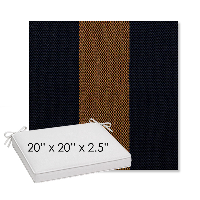 20" x 20" x 2.5" Thick outdoor dining chair seat cushion designed for a simple, ready-to-order fit. Features a boxed construction with piping, fabric ties, and zipper opening. Made in 700+ Sunbrella® fabrics for long-lasting outdoor performance.