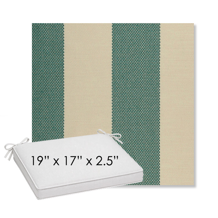 19" x 17" x 2.5" Thick outdoor dining chair seat cushion designed for a simple, ready-to-order fit. Features a boxed construction with piping, fabric ties, and zipper opening. Made in 700+ Sunbrella® fabrics for long-lasting outdoor performance.