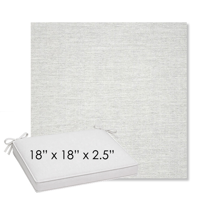 18" x 18" x 2.5" Thick outdoor dining chair seat cushion designed for a simple, ready-to-order fit. Features a boxed construction with piping, fabric ties, and zipper opening. Made in 700+ Sunbrella® fabrics for long-lasting outdoor performance.