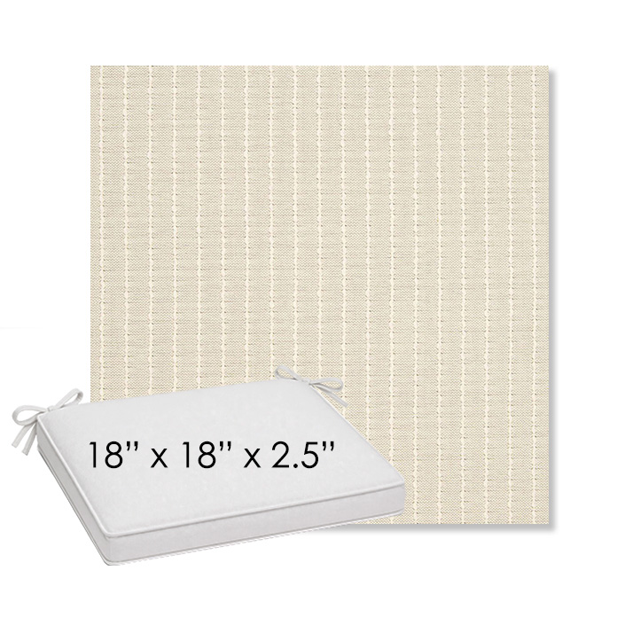 18" x 18" x 2.5" Thick outdoor dining chair seat cushion designed for a simple, ready-to-order fit. Features a boxed construction with piping, fabric ties, and zipper opening. Made in 700+ Sunbrella® fabrics for long-lasting outdoor performance.