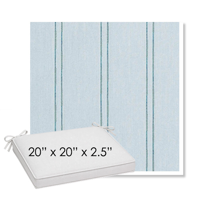 20" x 20" x 2.5" Thick outdoor dining chair seat cushion designed for a simple, ready-to-order fit. Features a boxed construction with piping, fabric ties, and zipper opening. Made in 700+ Sunbrella® fabrics for long-lasting outdoor performance.
